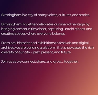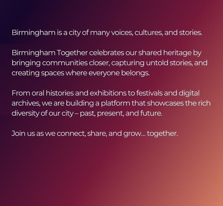 We’re excited to announce Birmingham Together, a new heritage and community project (funding application in progress with the National Lottery Heritage Fund). This initiative will celebrate the city’s diversity by capturing and sharing stories, memories, and creativity from people across Birmingham’s many communities.